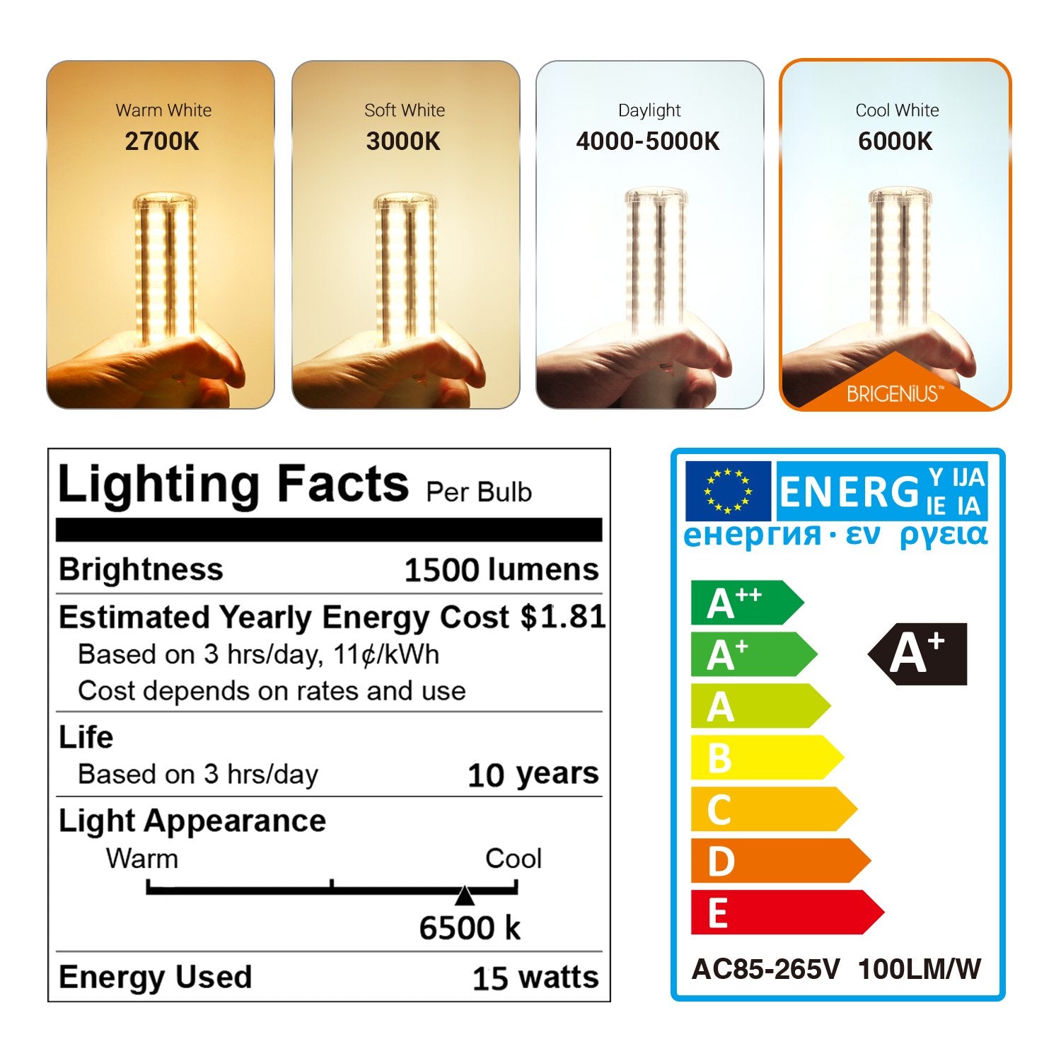 BRIGENIUS-E26 LED Corn Light Bulbs, 100W Equivalent 1500Lm 6500K Cool White,15W Daylight Led Corn Lamp Energy Saving for Indoor Room Home Household Lighting